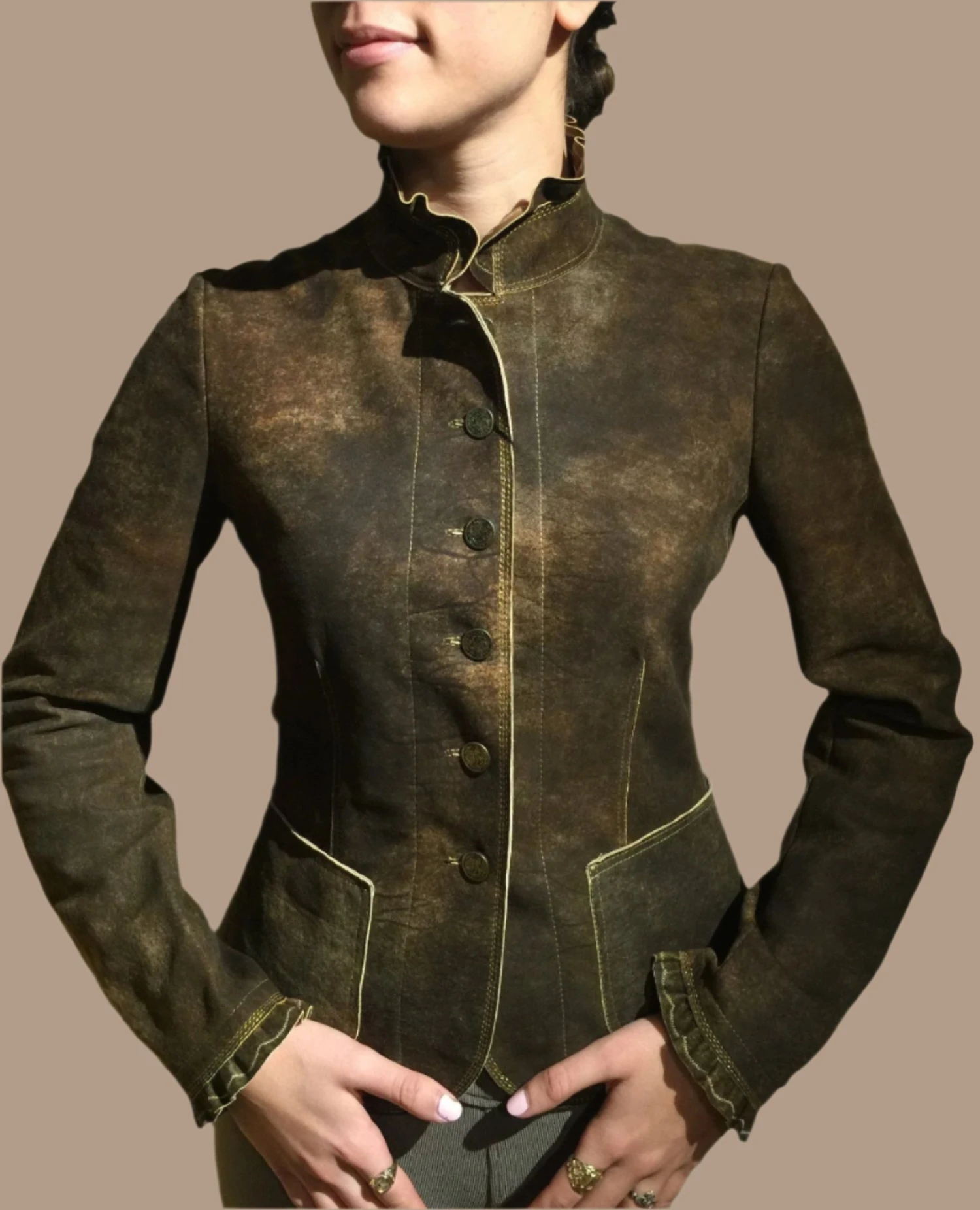 Be the first to review “Artico Gringolino Ruffle Leather Jacket Olive” Cancel reply
