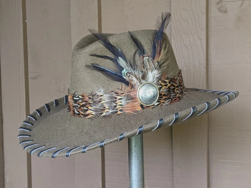 The Lanie felt hat is 100% wool and has a 3.75″ brim and 4.25″ crown. Hand laced in chocolate brown leather lace. Pheasant feather band and decorative navy blue, green and almond feathers with a large floral motif Concho completes the hat.